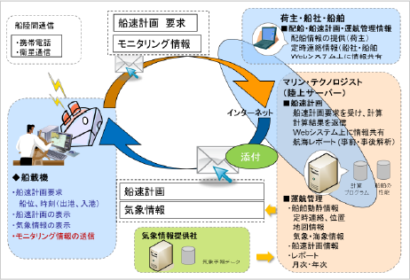 "eE-Navi Plan" is a navigation support system that assists ships by providing them with optimized navigation routes in their voyage. When voyage plans (arrival/departure time, etc.) are sent to the support system from a ship, it calculates the optimal voyage by considering weather and sea conditions and weather forecast to ensure that the ship arrives at the port at the planned time of arrival.